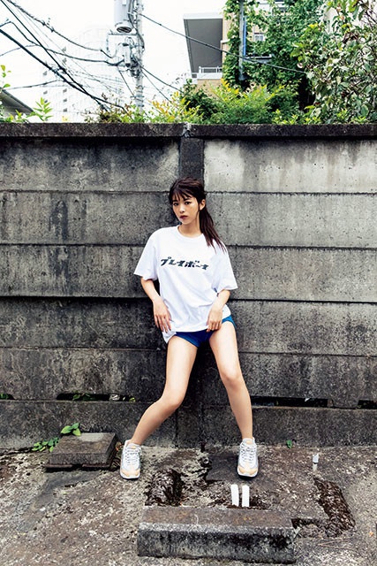 表紙では大胆に胸下で切ったTシャツを着て、バストからのラインと、美しいくびれを披露。巻頭グラビアでもランジェリーにフライトジャケットを羽織ったワイルドなスタイルや、カーディガンの間から柔らかなバストを垣間見せるなどスーパーボディーを惜しげもなく見せている。